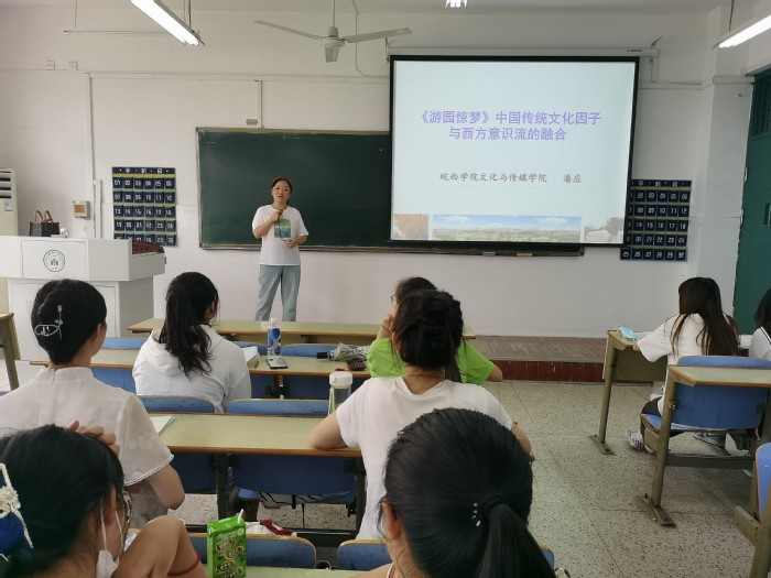潘应长期担任文传学院的《港台文学》课程,她结合白先勇的中篇小说《游园惊梦》,从三个方面论述中国传统文化因子和西方意识流的融合:传统的“人生如梦”主题与“意识流”手法的融合;小说中的传统事物与传统诗词对小说思想内容的丰富与拓展;唱词内容、戏剧名称与“意识流”的融合及其对情节发展和人物性格刻画的暗示作用。《游园惊梦》中传统写实部分占据三分之二篇幅,反映出作者对传统文化的深刻理解与精妙化用,小说的阐释空间由此扩大;借鉴西方意识流手法,运用感官印象、内心独白和联想等方式进入人物心理和感情深处,使得人物在梦与醒、过去与现在之间切换与穿梭。这种“中西合璧”式书写,折射出台湾上流社会人物的没落命运与乡愁思绪,也体现出作者对中国传统文化的深重依恋。她鼓励同学们珍惜青春,不负时代,多读中国传统文化典籍,在传承与创新中华优秀传统文化的青春赛道上跑出当代大学生优秀的成绩。